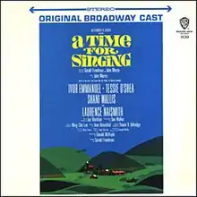A Time for Singing is a musical with music by John Morris, lyrics by Gerald Freedman and John Morris, and a book by Freedman and Morris. The work was based on Richard Llewellyn's novel of a Welsh mining village, How Green Was My Valley.[1] The show takes place in the memory of Protestant minister David Griffith, recalling conflict within the Morgan family over the possible formation of a miners' union within the village, and the romance between Griffith himself and Angharad of the Morgans, who ultimately marries the mine owner instead. The show starred Ivor Emmanuel (as David Griffith), Tessie O'Shea, Shani Wallis and Laurence Naismith.