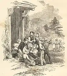 The Hawthornes had moved to The Berkshires shortly after the publication of The Scarlet Letter and it was here that he completed not only A Wonder-Book but also his novel The House of the Seven Gables.[4] He was able to spend time with several other literary figures, including Herman Melville, who was then living at Arrowhead in Pittsfield. Melville is referenced by name in A Wonder-Book: "On the higher side of Pittsfield, sits Herman Melville, shaping out the gigantic conception of his 'White Whale' while the gigantic shape of Graylock [sic] looms upon him from his study-window."[5] Biographer Philip McFarland called this period "by far the most productive creative period of Hawthorne's life", though it also marked the end of his time as a writer of short tales.[6] The Hawthornes would soon move temporarily to West Newton, Massachusetts, where the author would begin to write The Blithedale Romance, a novel he conceived while in Lenox.[7]