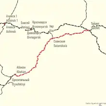 The Abakan-Taishet Railway is a railway built between 1959 and 1965, connecting Abakan with Tayshet on the Trans-Siberian Railway. It lies in Krasnoyarsk Krai along with parts of the Republic of Khakassia and Irkutsk Oblast. The line is a continuation of the Novokuznetsk - Abakan Railway which was built between 1949 and 1950. Construction of the Abakan-Taishet Railway was announced as a Komsomol shock construction project, and young workers came from all parts of the Soviet Union to build the line.