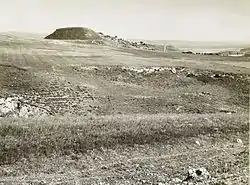 Excavation areas are marked on this 1945 aerial photo of the tell (Aerial Photographic Archive, Geography Department, Hebrew University of Jerusalem, taken by the Royal Air Force, Section 23, 1945); the houses visible on the photo belong to the Arab village of Abil al-Qamh.