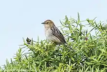 The Aberdare cisticola is 12–15 cm (4.7–5.9 in) in length, and weighs 18–24 g (0.63–0.85 oz). It is a large and stocky cisticola with a heavy bill, plain face, boldly striped upperparts, and a medium-long graduated tail.[2][3] Its voice is a mixture of peeuu tew tew and other short trills.[2]