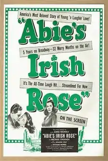 Abie's Irish Rose is a 1946 American comedy film directed by A. Edward Sutherland based on a play by Anne Nichols. The film stars Michael Chekhov, Joanne Dru, Richard Norris, J. M. Kerrigan, George E. Stone, Vera Gordon, and Emory Parnell. The film was released on December 27, 1946, by United Artists.[1][2] It was a remake of the 1928 film that was based on the 1922 play Abie's Irish Rose by Anne Nichols. The film drew criticism for stereotyping and additional cuts were made after complaints.[3]