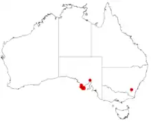 It is native to southern parts of the Eyre Peninsula on the south west coast between Mount Dutton and Mount Drummond. On the south east coast the shrub is found between Billy Light Point close to Port Lincoln to the Lincoln National Park[2] where it grows in sandy soils over limestone and sometimes in skeletal soils above granite.[1]
