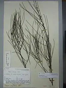 The shrub or tree has a spindly open habit and typically grows to a height of around 5 metres (16 ft). It has pendulous branches and red-brown coloured slender branchlets. The filiform, terete to quadrangular, phyllodes have a length of 12 to 24 cm (4.7 to 9.4 in) and a width of 0.5 to 0.8 mm (0.020 to 0.031 in).[1] The simple inflorescences have spherical flower-heads that contain around 35 yellow coloured flowers. The linear brown seed pods that form after flowering are raised over the seeds alternately. The pods have a length of up to 15 cm (5.9 in) and a width of 3.5 to 5 mm (0.14 to 0.20 in). The turgid, dull brown seeds inside have an oblong to elliptic shape and are 4 to 6 mm (0.16 to 0.24 in) in length and 2 to 2.5 mm (0.079 to 0.098 in) wide.[1]