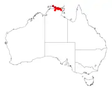 It is found from the northern part of Arnhem Land to the Cobourg Peninsula in the Northern Territory, growing in sand in swampy areas on coastal river flats or near streams in the gorge country, or sometimes in open forest.[3][2]