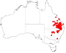 It is endemic to north western New South Wales and south eastern Queensland. It is found on the plains around Cobar and Nyngan in the south withit's range extending north through Yetman and the Pilliga Scrub into south eastern Queensland from around Goodiwindi and Moonie, Queensland in the south up to around Eidsvold in the north where it is found in rocky hillsides in loamy or sandy soils as a part of Eucalyptus forest and woodland communities or sometimes dense scrubland.[1]