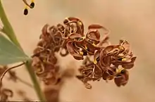 The shrub typically grows to a height of 2 to 4 m (6 ft 7 in to 13 ft 1 in) or is found sometimes as a tree up heights of around 9 m (30 ft) usually with a spreading habit. It has sericeous new shoots with pale yellow-brown hairs that age to have a silvery colour. The acutely angled branchlets are silvery-sericeous. The silvery-green to grey-green phyllodes usually have an obliquely narrowly elliptic shape that is more or less straight but often shallowly recurved at the apice. The phyllodes are around 11 to 20 cm (4.3 to 7.9 in) in length and have a width of 1 to 5.5 cm (0.39 to 2.17 in) and have a knob shaped mucro. The rudimentary inflorescences occur in pairs in the racemes and have a axes length of 0.5 mm (0.020 in). The golden flower spikes are 3.5 to 6 cm (1.4 to 2.4 in) in length with hairy petals. The seed pods that form later are openly and strongly curved or tightly and irregularly coiled or twisted with twisted dehisced valves. The glabrous pods have a width of 3.5 to 4 mm (0.14 to 0.16 in) and are thinly coriaceous to crustaceous. The glossy brown to black coloured seeds within the pods have an oblong shape and are 4 to 4.5 mm (0.16 to 0.18 in) in length with a bright yellow aril.[6]