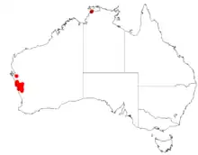 It is native to an area in the Mid West region of Western Australia where it is commonly situated on sandplains growing in sandy soils.[1] The shrubs range extends from around Geraldton in the north to around Coorow in the south.[2]