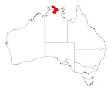 It is restricted to a small area in the top end of the Northern Territory along the Coburg Peninsula and the upper catchments of the Alligator and Liverpool Rivers where it is commonly situated in gorges or sandstone escarpments growing in skeletal sandy or deep sandy soils.[1]