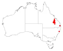 It is found in a small area of the Central Highlands region of Queensland on the Blackdown tableland to the south of Blackwater as a part of Eucalyptus woodland communities growing in sandy sandstone based soils.[1]