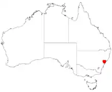 It has a limited distribution on the central coast of New South Wales where it is found mostly in the Kulnara to Bucketty and Mangrove Mountain areas extending northward to north to the Hunter Valley area around Kurri Kurri and Cessnock. It is usually situated on ridges and upper slopes in and around sandstone outcrops as a part of dry sclerophyll woodland or forest communities.[1]