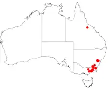It is native to parts of New South Wales from around the Blue Mountains in the Kybean Range near Lake Eucumbene in the north and extending discontinuously to around Freestone Creek near Suggan Buggan in north eastern Gippsland[4] area of Victoria to the south. It is often found on rocky slopes in rocky sandy soils as a part of Eucalyptus woodland communities.[1]