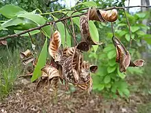 The tree has papery, flaky yellow-brown[2] bark and typically grows to a height of 4 to 15 metres (13 to 49 ft).[3] The trunk of the tree rarely exceeds 30 centimetres (12 in) in diameter.[1] The slender glabrous branchlets are often pendulous in form.[2] The grey-greenphyllodes have a length of 7.5 to 14.5 centimetres (3.0 to 5.7 in) and a width of 0.9 to 1.8 cm (0.35 to 0.71 in).[1] It blooms from April to June producing pale yellow flowers.[3] The flower spikes reach a length of up to 5 cm (2.0 in) found as aggregated groups of one to five[2] located on the upper axils.[1] Following flowering oblong to narrowly oblong woody seed pods form that twist into a spiral one to three times. The pods are 2 to 12.5 cm (0.79 to 4.92 in) in length and 1.4 to 3.2 cm (0.55 to 1.26 in) wide and contain irregularly-shaped glossy black seeds that are 4 to 7 mm (0.157 to 0.276 in) long and half as wide.[2]