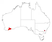It is native to an area in the Great Southern and Goldfields-Esperance regions of Western Australia where it is commonly situated on rocky cliffs, along watercourses, on sandplains and on coastal cliffs and dunes growing in sandy or loamy or clay soils often over or around limestone, laterite or quartzite.[1] Its distribution extends from around Beaufort Inlet in the west to around Munglinup in the east, the bulk of the population being found in Fitzgerald River National Park with an isolated population between Lake King and Newdegate to the north west.[2]
