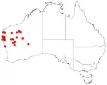 It is native to an area in the Mid West, Gascoyne, Pilbara and Goldfields-Esperance regions of Western Australia where it is commonly situated on alluvial flats growing in sandy of loamy soils often over or around limestone.[2] The bulk of the population is found in the Gascoyne and in the upper catchment of the Murchison River with the range extending from Shark Bay in the west to around Mileura Station in the east. Other disjunct populations are found in the Pilbara from around Roy Hill Station and Ethel Creek Station. In the west the tree is usually a part of low chenopodiaceous shrubland communities but is eastern areas it more often part of scrublands featuring other species of Acacia including Acacia paraneura, Acacia xiphophylla and Acacia pruinocarpa or on flat spinifex plains.[1]