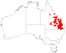It is endemic to parts of Queensland and New South Wales and is fairly widespread throughout the Darling Downs region. The northern end of its range is to about 120 km (75 mi) to the south of Charters Towers it is found as far as Adavale to the west and down to around Yetman in the south.[1] The tree will often forms dense stands and is sometimes associated with Acacia shirleyi and also as a part of open forests and Eucalyptus woodlands growing in shallow stony soils usually over a bed of weathered sandstone.[1]