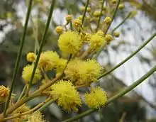 The species grows to between 1 and 4 metres high and has phyllodes that measure 6 to 14 cm long and 0.8 to 1.5 mm wide. These are straight or slightly curved. The globular yellow flowerheads appear in racemes (groups of 3 to 11) in the phyllode axils predominantly from June to December. Plants may flower up to three times a year. These are followed by straight or slightly curved seed pods that are 4 to 18 cm long and 4 to 8 mm wide.[3]