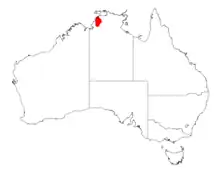 It is native to a small area of the western side of the top end of the Northern Territory from the Tabletop Range in the north to around the Daly River in the south growing in sandy soils as a part of open forest communities.[1]