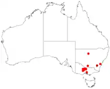 It is endemic to parts of northern-central Victoria from around Inglewood in the south to Rushworth in the north with large populations found in the Whipstick Forest around Bendigo where it is found growing in stony gravel or clay-loam soils as a part of open Eucalyptus forest and mallee scrubland communities.[3]