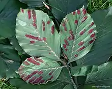 Aceria nervisequa causes felt-like galls (erinea)[lower-alpha 1] on the underside of the leaves of European beech (Fagus sylvatica), copper beech) (Fagus sylvatica purpurea) and Crimean beech (Fagus x taurica). The erinea are white at first, turning pink and than brown by the autumn while on copper beech the erinea are pink, bright crimson or purple. The mites also cause erinea along the veins on the upper side of the leaf which were initially thought to be a separate species; known as Aceria faginea. The mites spend the winter in bark crevices or in buds.[3][4][5]