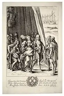 In Dares Phrygius' Account of the Destruction of Troy,[31] the Latin summary through which the story of Achilles was transmitted to medieval Europe, as well as in older accounts, Troilus was a young Trojan prince, the youngest of King Priam's and Hecuba's five legitimate sons (or according other sources, another son of Apollo).[32] Despite his youth, he was one of the main Trojan war leaders, a "horse fighter" or "chariot fighter" according to Homer.[33] Prophecies linked Troilus' fate to that of Troy and so he was ambushed in an attempt to capture him. Yet Achilles, struck by the beauty of both Troilus and his sister Polyxena, and overcome with lust, directed his sexual attentions on the youth – who, refusing to yield, instead found himself decapitated upon an altar-omphalos of Apollo Thymbraios.[34] Later versions of the story suggested Troilus was accidentally killed by Achilles in an over-ardent lovers' embrace.[35] In this version of the myth, Achilles' death therefore came in retribution for this sacrilege.[36] Ancient writers treated Troilus as the epitome of a dead child mourned by his parents. Had Troilus lived to adulthood, the First Vatican Mythographer claimed, Troy would have been invincible; however, the motif is older and found already in Plautus' Bacchides.[37]