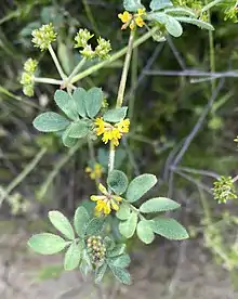 Acmispon micranthus is a species of legume native to California and northwestern Mexico.[1][2] It is known by the common name San Diego bird's-foot trefoil. It is found in the coastal mountain ranges of California and Baja California, where it grows in various types of scrub and canyon habitat. It is an annual herb taking a spreading or upright form. It is lined with leaves each made up of oval leaflets each about a centimeter long. The inflorescence is a small bunch of red and yellow flowers. Each flower is in a tubular calyx of sepals and is only a few millimeters long. The fruit is a narrow, bent legume pod up to 1.5 centimeters long, including the hooked beak at the tip.