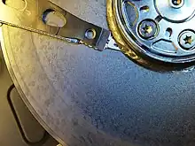 A head crash, one type of disk failure. The platters should normally be smooth in modern drives, and a head crash results in partial to total data loss, as well as irreversible damage to the platters and heads. Particles may also be liberated during this process, making the insides of the drive not clean enough for operation.