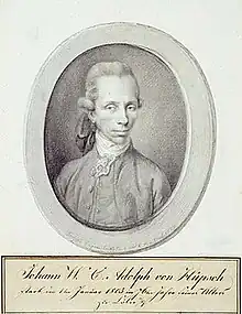 Hüpsch was born to as Jean Guilleaume Fiacre, the son of a court official Gerard Honvlez (d. 1746) and Anna Maria Kesler in Vielsalm (now in Belgium). He studied at the Marianum in Aachen and the Tricoronatum Gymnasium in Cologne (1749-50) before studying law, medicine, and natural sciences in Cologne. In 1755 he took the title and surname from his grandmother von Hupsch from Lontzen. He published various books on geophenomenology (1764), natural history of lower Germany (1781) and on ancient inscriptions in 1801. He gradually enhanced his name and titles and called himself Johann Wilhelm Carl Adolph Freiherr von Hüpsch, Herr zu Lotzen, zu Krickelhausen und auf der Motte claiming a pedigree back to the Roman family of Aemilianus. He made money selling patent medicines and from 1768 lived in the Lützeroder farm. He filled his home with collections and his housekeeper Mechtild Happertz (1725 – 1805) gave tours of his cabinet to visitors. In his will, he appointed the collector Ludwig X, Landgrave of Hesse-Darmstadt as his heir. Ludwig had purchased the mineral collection of Hüpsch in 1802. Many of his collections are now in the Hessisches Landesmuseum Darmstadt.[1][2][3][4]