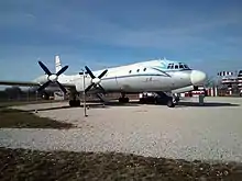 This Il-18V arrived in Hungary in 1964. Unlike the previous one, it was not an overhauled Il-18 but a newly built Il-18V. Its first passenger flight was to Moscow. In 1967 its original engines were replaced with AI-20K engines. Its last passenger flight was in late 1978 between Sofia and Budapest, then it was converted into a cargo aircraft. Its last cargo flight was in October 1988 between Constantine, Algeria and Budapest. The next day one of its engines was damaged by a fire and the plane, which was planned to be written off in December, was written off after the fire. Between 1993 and 2006 it was used by Malév for training. In 2006 a petition was started against the demolition of the plane,[11] and it was moved to the aviation museum. Its exterior was restored in June 2014, but the interior continues to be in a bad condition. Its total flight time is 36,558 hours.[10]