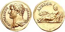 She was one of a number of "province personifications" such as Britannia, Hispania, Macedonia and a number of Greek-speaking provinces. Africa was one of the earliest to appear, and may have originated with the publicity around Pompey the Great's African triumph in 80 BC; some coins with both Pompey and Africa shown survive.[7]
