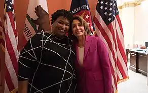 One critical factor of the 2020 United States presidential election win was the efforts of Black women and other people of color who helped to energize and register voters across the United States. Stacey Abrams, former Representative of Georgia (2007 to 2017) and minority leader (2011 to 2017), founded both Fair Fight Action and New Georgia Project, organizations focused on addressing voter suppression and voter registration, and is often considered to be one of the key people to encourage voter outreach programs that affected the 2020 election in Georgia.[29] Abrams and other prominent women of color worked for several years registering voters and continued to register more than 800,000 new voters in the time leading up to the 2020 election.[30] While Georgia went to Donald Trump during the 2016 election, fueled by a mostly white, Republican electorate, Abrams and her cohorts chose to focus on persuading apathetic voters of color that their votes did matter rather than focusing on undecided white voters.[31] As a result of these efforts as well as changing ideology in white voters, Georgia went to Democrats during the 2020 election, the first time the state went blue since 1992.[32][33] Abrams was also the first Black woman to deliver a response to the State of the Union address. In 2020, more than two-thirds of black women had "turned out to vote in the 2020 presidential election." This was in fact "the third highest rate of any race-gender group."[34] However, this increase in voting did see a decrease in the percentage of black women who voted Democrat, with a 4% decrease of the number of black women voting for the democratic presidential candidate from 2016. Despite this, the democratic candidate, Joe Biden, still won the election.