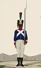 The number of black soldiers in the Andean army of San Martín during the liberation of Chile from the Spanish throne[15] was numerous and the majority of soldiers from the regiments called numbers 7, 8 and 11 of the Andes infantry were grouped together, but in said regiments all the officers and non-commissioned officers they had to be white according to Argentine law, although San Martín wanted to change the rules so that at least black soldiers would reach the ranks of corporals and sergeants. However, traditionally the Spanish colonial army had battalions of blacks divided into slave and free castes, and San Martín believed it even more difficult to gather people of color and whites fighting as a troop in the same unit. Later both groups numbers 7 and 8 will be recast in Peru in the black regiment of Río de la Plata. The number 4 of Chile, initially white Creoles, will also be converted by his slave recruit from Peru into a black regiment.[16] So the origin of the recruit of people of color was geographically diverse, and consisted of black slaves or freedmen (whether they are Africans or Creole blacks), and in addition to free castes, called in the colony pardos and morenos.