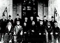 Ahmed Uthman in a group photo with his fellow Iraqi Senators in 1933. Sitting from right: al-Haj Muhammad al-Istirbadi, Alwan al-Yasiri, al-Haj Hassan al-Shaboot, Muhammad al-Sadr, Muhammad Ali Bahr al-Ulloom, Noor al-Yassiri, Aday al-Jaryan. Standing from right: Azra Menachem Daniel, Abdullah al-Safi, Fakhri Al Jamil Qasim Agha, Yassin al-Khidhri, Ahmed Uthman Effendi, Maulood Mukhlis, Taha al-Rawi.
