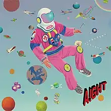 The cover art concept of Aight is outer space. The theme was chosen to liken the size of space to Jung's musical capacity.[6] It compromises illustrations of rockets, airplanes, and planets set against a mint-colored gradient background.[14] It also includes an Iris flower which stands for "the only love", a rabbit that symbolizes B.A.P's fandom, fireworks which signify the celebration of a new beginning, and a flock of birds that represent his fans. Jung is portrayed as an astronaut wearing a pink spacesuit, which replicates the color of his Kekemato bunny mascot from B.A.P. The suit contains a depiction of Ganji, Jung's pet Bichon Frise. It also bears the numbers "2-1" which denote part one of his second chapter as a soloist and the letters "J/L" for Jung Dae-hyun and Lionheart.[6] The album photography was shot my Moke Na-jung.[15] It shows Jung with a "natural" look, which he described as "mostly dreamy and fantasy-like".[6]