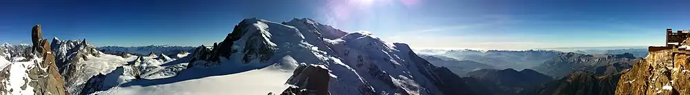 The Aiguille du Midi (French pronunciation: [eɡɥij dy midi], "Needle at midday") is a 3,842-metre-tall (12,605 ft) mountain in the Mont Blanc massif within the French Alps. It is a popular tourist destination and can be directly accessed by cable car from Chamonix that takes visitors close to Mont Blanc.[2]