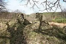 The castle was built on a steep promontory above a loop on the river.[1] It was naturally defended on three sides; there is evidence of artificial scraping on the narrow ridge by which the castle may be approached from the other side.[3]