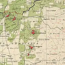 The population grew to 690 in the 1945 statistics, still all Muslim.[3][21] Together with the nearby villages of Shaykh Dannun and Shaykh Dawud, the village had 11,771 dunums of land in 1945.[4] The local economy was based on livestock and agriculture.[22] In 1944/45 a total of 6,633 dunums of land in the three villages was used for cereals, 1,371 dunums were irrigated or used for orchards,[23] and 58 dunams were built-up (urban) land.[24] 300 dunums in Ghabisiyya were planted with olive trees.[22]