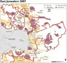 Services like electricity supply were transferred from Palestinian to Israeli companies, and a ministerial decision established a policy that the ratio of Jews to Palestinians, as a matter of policy, would be 76 to 24,[81] though the 2000 Masterplan adjusted this to a 70-30 ratio, which in turn had to be subject to a 60-40% proportion given Palestinian demographic growth, which now constitutes 37% of the city's population.[82] When offered a path to Israeli citizenship, the overwhelming majority opted for resident status instead, and adopted a boycott strategy against Israeli institutions.[83][lower-alpha 14] 90% of the land of East Jerusalem included thereafter in its municipality was added after 1967 by expropriating in most cases village or private land owned by people, not from East Jerusalem itself, but who were living in 28 Palestinian villages. According to its former deputy mayor Meron Benvenisti, the plan was designed in such a way as to incorporate a maximum of land with a minimum of Arabs.[84][lower-alpha 15] Thereafter a property tax (arnona) regime was introduced which allowed Jewish settlers a 5-year exemption and then reduced taxes, while leaving Jerusalemite West Bankers, whose zones are classified to be in the high property tax bracket, paying for 26% of municipal services, while themselves receiving only 5% of the benefit (2000).[86] By 1986 60% of Arab East Jerusalem lacked a garbage collection infrastructure, schools could not expand classrooms and were forced into a unique double-shift system.[87] Jewish neighbourhoods were allowed to build up to eight storeys high while Palestinians in East Jerusalem were restricted to two.[88] The area's infrastructure still remains in a state of neglect.[lower-alpha 16] According to B'Tselem, as of 2017, the 370,000 overcrowded West Bankers in this zone are bereft of any control over their lives, given extreme restrictions on the movement of residents without any advance notice. Their residency can be revoked; building permits are rarely given and a separation wall fences them off from the rest of the city. Every day 140,000 Palestinians have to negotiate checkpoints to work, get a medical check-up or visit friends.[90] Poverty has steadily increased among them, with 77% of "non-Jewish" households in Jerusalem under the Israeli poverty line, as opposed to 24.4% of Jewish families (2010).[91]