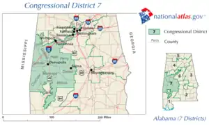 The shape of the current district was largely established in 1992, when it was reconstituted as a majority-minority district under provisions of the Voting Rights Act of 1965, as amended in 1982 to encourage greater representation for minorities in Congress.[5] Half of the western Alabama portion of the district was moved to the 4th district, and a large portion of Tuscaloosa County was moved into the 6th district, which had primarily been based around Birmingham. To counter the loss in population and to create the majority-minority, many counties from the Black Belt region, a rural expanse in Alabama with a high proportion of African-American residents descended from workers on cotton plantations, were added to the district, as was an arm extending from Tuscaloosa roughly along the Interstate 20/59 corridor into Jefferson County to take in most of the black precincts of Birmingham. Most of Birmingham's white residents remained in the 6th district. The three representatives elected from the district following reconfiguration—Earl F. Hilliard, Artur Davis, and Terri Sewell—have all been residents of Birmingham.