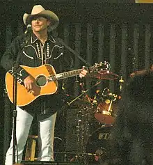 Due to a shift in the sound of country music towards a more pop sound in the 1990s and 2000s, he and George Strait criticized the state of country music in the song "Murder on Music Row". The song sparked debate in the country music community about whether "traditional" country music was actually dead or not.[20] Despite the fact that the song was not officially released as a single, it became the highest-charting nonseasonal album cut (not available in any retail single configuration or released as a promotional single to radio during a chart run) to appear on Hot Country Singles & Tracks in the Broadcast Data Systems era, beating the record previously held by Garth Brooks' "Belleau Wood." The duo were invited to open the 2000 Academy of Country Music Awards (ACMAs) with a performance of the tune.[21] Rolling Stone commented on Jackson's style remarking, "If Garth and Shania have raised the bar for country concerts with Kiss-style production and endless costume changes, then Alan Jackson is doing his best to return the bar to a more human level."[22] After the September 11, 2001 attacks, Jackson released "Where Were You (When the World Stopped Turning)" as a tribute to those killed in the 9/11 terrorist attacks. The country/soft rock song became a hit single and briefly propelled him into the mainstream spotlight; Jackson had debuted the song at the 2001 CMA Awards and his performance was generally considered the highlight of the show. Jackson's website crashed the next day from server requests.[23] The song came to Jackson suddenly, and had not been scheduled for any official release, but the live performance began receiving radio airplay and was soon released as a single. It was included on his 2002 album Drive, both the live version from his CMA performance, and a radio version.