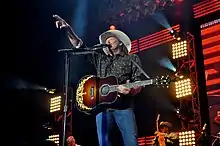 In 1989, he was nominated for a total of six Country Music Association Awards (CMAs).[10] He was nominated for four 1994 CMAs, including Entertainer of the Year.[38] Jackson became a member of the Grand Ole Opry in 1991; he was inducted by Roy Acuff and Randy Travis.[39][40][41] Jackson was the most nominated artist at the 29th annual TNN/Music City News Country Awards that was broadcast June 5 from the Grand Ole Opry House. His six nominations included best entertainer, male artist, vocal collaboration, album, single, and video (two nominations in this category).[42] At the 2002 CMAs, Jackson set a record for having the most nominations in a single year – ten – many rising from the song "Where Were You". It also brought his career total up to the second number of most nominations ever, after George Strait.[43] "Where Were You" also was nominated for a Grammy for Song of the Year. At the 2003 Academy of Country Music Awards, Jackson won Album of the Year for Drive and Video of the Year for the video to "Drive (For Daddy Gene)."[44]