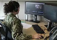 A member of the Alaska Naval Militia edits video footage she took as public affairs coverage of COVID-19 response efforts from the Alaska National Guard, Alaska State Defense Force and the Alaska Naval Militia.