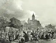Historically Alaverdoba lasted for three weeks in a three-step cycle, reflecting pre-Christian cults related to the Moon. In the 19th century, a tradition of agricultural fair was added to the festival. It has been a subject of several contemporary ethnological accounts and travelogues[1] as well as the focus of Giorgi Shengelaya’s 1962 semi-documentary Alaverdoba.[2]