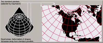 The Albers equal-area conic projection, or Albers projection (named after Heinrich C. Albers), is a conic, equal area map projection that uses two standard parallels. Although scale and shape are not preserved, distortion is minimal between the standard parallels.