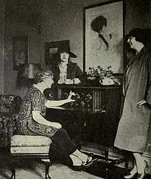 Alberta Neiswanger Hall (seated) listening to the radio along with Mrs. Dr. Elliott Norton (center) and Frances Peralta, (right) soprano of the Metropolitan Opera Company.