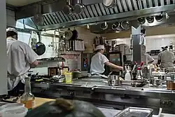 The restaurant occupied two stories, and had an open kitchen,[2] so that diners could observe the preparation of food.[3] It was decorated in a minimalist style with birch trees in its interior.[4] Adam Platt of New York, described the interior in 2009 as a "double-height, blond-wood-paneled space is set with chairs covered in plush white and blue leather, and the view of the outside world is filtered by a façade of white-striped glass. The room is luminously lit and partitioned with sheets of more glass, which make it feel intimate and also worldly".[3]