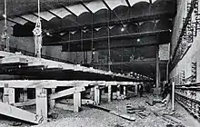 In order to accommodate the space needed for the underpass, the existing track needed to be lowered by more than seven feet (2 m). To achieve this task whilst still keeping the track open during the day, the bed underneath the track was excavated and the track held up by a timber trestle framework. Once excavation was complete and the new station had been constructed around the site, an army of over 900 workmen lowered the whole track simultaneously in one night using overhead hooks to suspend the track when necessary.[12] The hooks still remain.