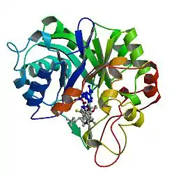 Alcohol dehydrogenase [NADP+] also known as aldehyde reductase or aldo-keto reductase family 1 member A1 is an enzyme that in humans is encoded by the AKR1A1 gene.[5][6][7] AKR1A1 belongs to the aldo-keto reductase (AKR) superfamily. It catalyzes the NADPH-dependent reduction of a variety of aromatic and aliphatic aldehydes to their corresponding alcohols and catalyzes the reduction of mevaldate to mevalonic acid and of glyceraldehyde to glycerol.[8] Mutations in the AKR1A1 gene has been found associated with non-Hodgkin's lymphoma.[9]
