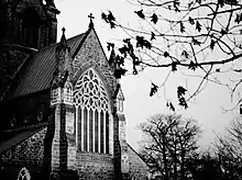 In 1879 Ewing was posted to Malta and subsequently served in Ceylon (now Sri Lanka) before returning to England. He spent the last six years of his career in Taunton and retired in 1889. Juliana Horatia Ewing died in 1885 and Ewing was married a second time to Margaret Elizabeth Cumby (1842–1930). He died in Taunton in 1895.[1] In 1899 a stained glass window by Charles Eamer Kempe in memory of Alexander and Juliana Horatia Ewing was installed in All Saints' Church in Trull, overlooking their graves.[10]