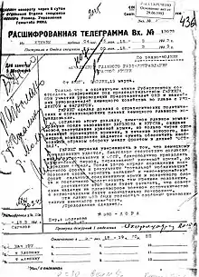 In July 1920, Radó was first a journalist and later director of the information agency ROSTO (Rossifskoie Telegrafsnoie Agentur) in Vienna, that he ran until 1922. [17] It was used to spread propaganda received in broadcasts from Soviet Russia.[17] To receive these, he had bribed the head of a Vienna radio station. Information bulletins from these materials were distributed to left-wing newspapers and organizations in various countries.[18] In July 1921, through the influence of his friends that he met in Germany, Rosa Luxemburg and Karl Liebknecht,[3] he was brought to Moscow to attend as a delegate to the third congress of the secretariat the Communist International ("Comintern").[10] While in Moscow he began to court Helene Jansen, a secretary who was then working in the office pool of Lenin's office.[8] An ardent communist and KPD member, he had first met her in Vienna[8] where she had worked in the secretive Balkans office of the Comintern.[19] Radó got to meet Comintern president Grigory Zinoviev[3]